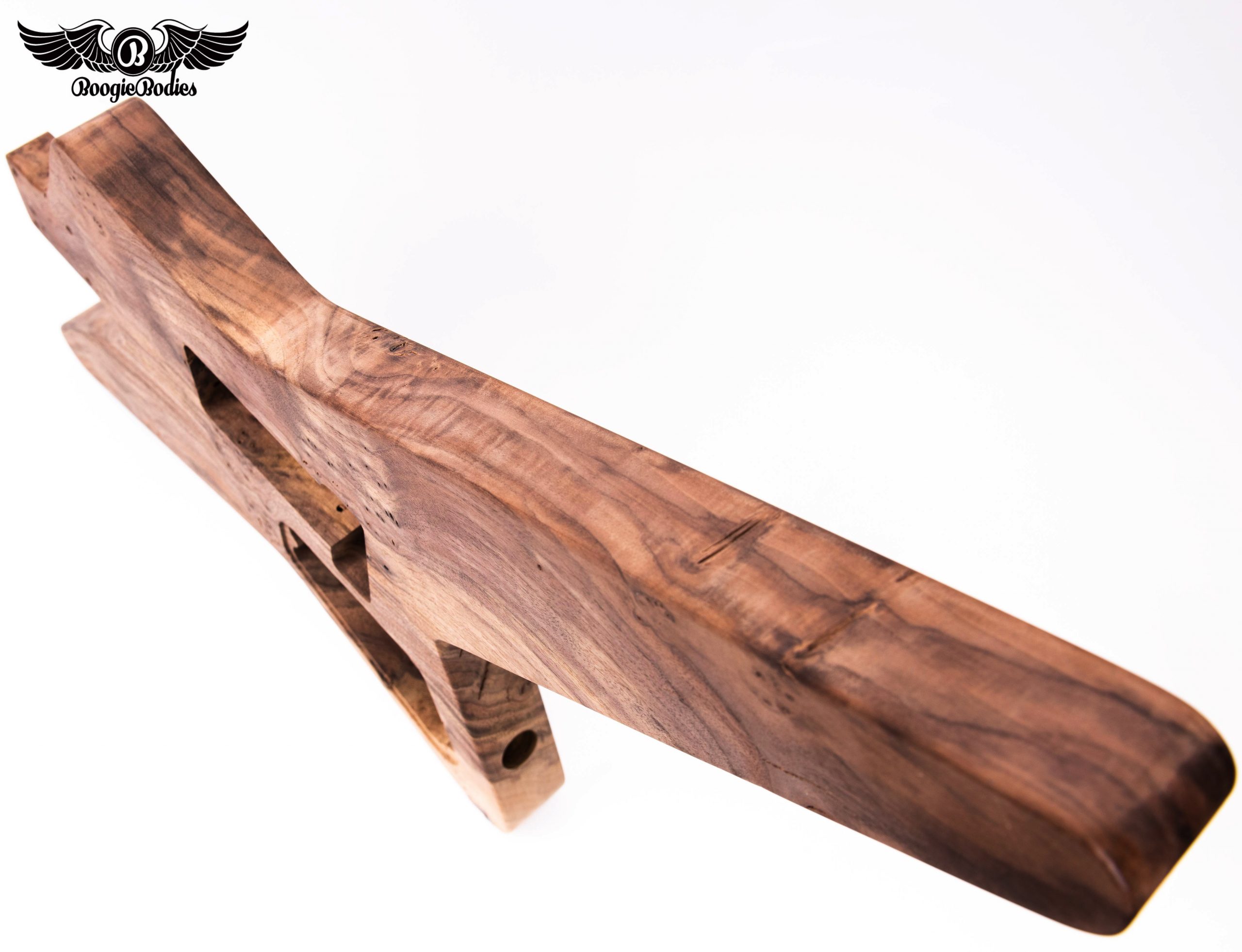 This Boogie Bodies 1-Off Burled Walnut Star Body – 1 piece is truly a work of art! Weighing in at 4.9 lbs, cut for a single humbucker and most locking tremolos (a custom FU2 Trem would do just right!) – This will look great with a nice oil finish and a hand-rubbed wax (that’s what I would do.) – There are some open pores and knots that give it a unique character  – see pics! 2 1/4″ Neck Pocket. Don’t miss out on this one of a kind body! Build your dream guitar!
